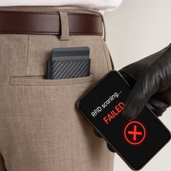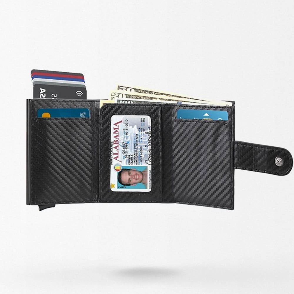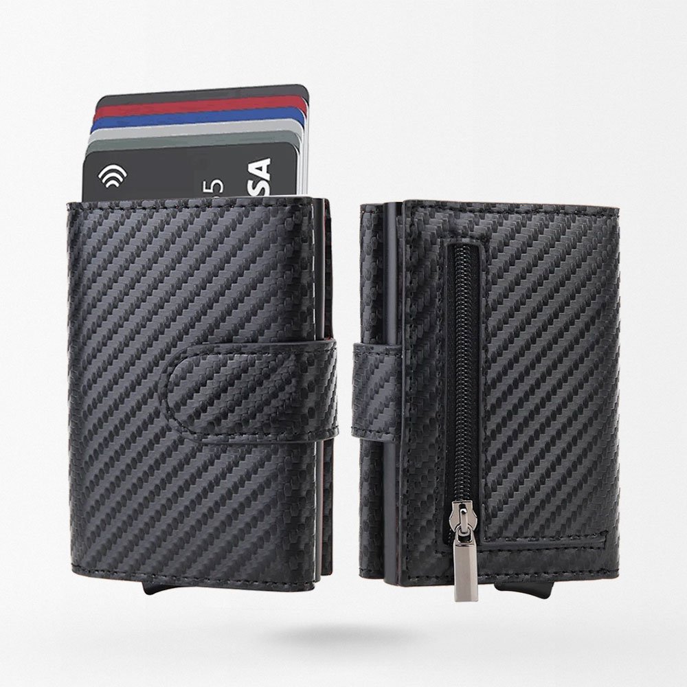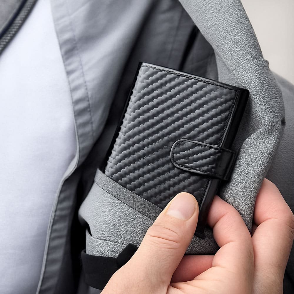 The Carbon Fiber Tactical Wallet combines sleek design with practical functionality. Crafted from microfiber synthetic leather, it features a secure RFID-blocking aluminum card box, holding up to 9 cards. With compartments for coins, notes, and photos, this wallet ensures your essentials are organized and protected. Available in striking Carbon + Orange and Carbon + Blue, it’s the perfect companion for the modern, security-conscious individual.