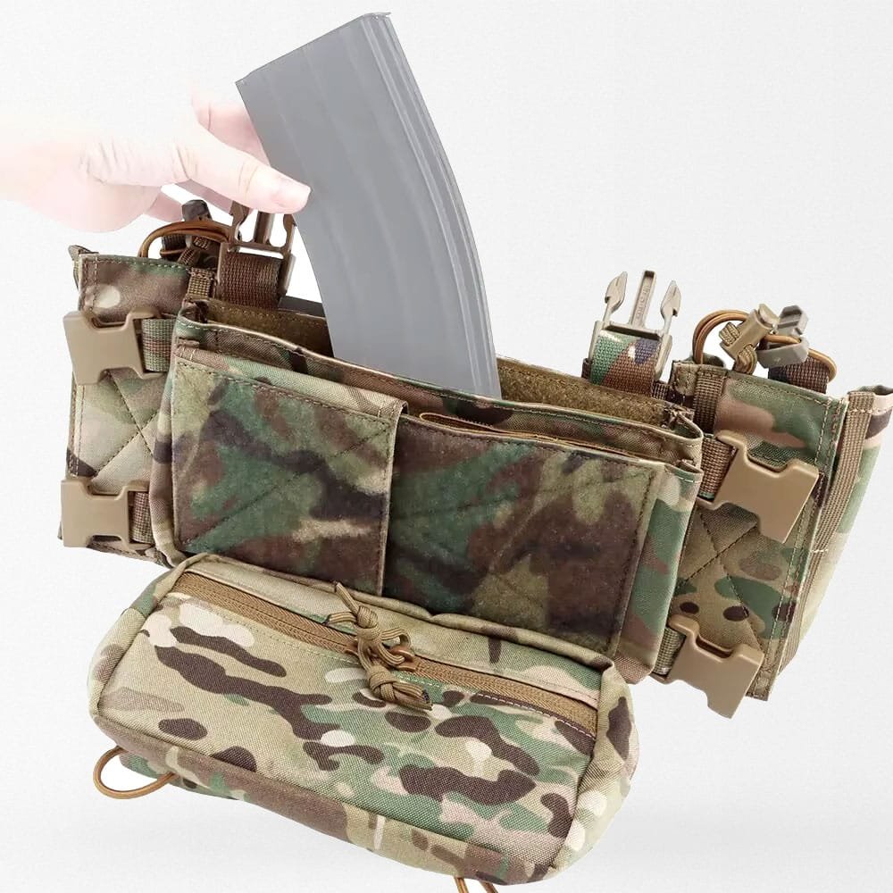 - Equipped with 5.56 triple magazine pouch and 9mm double magazine pouch