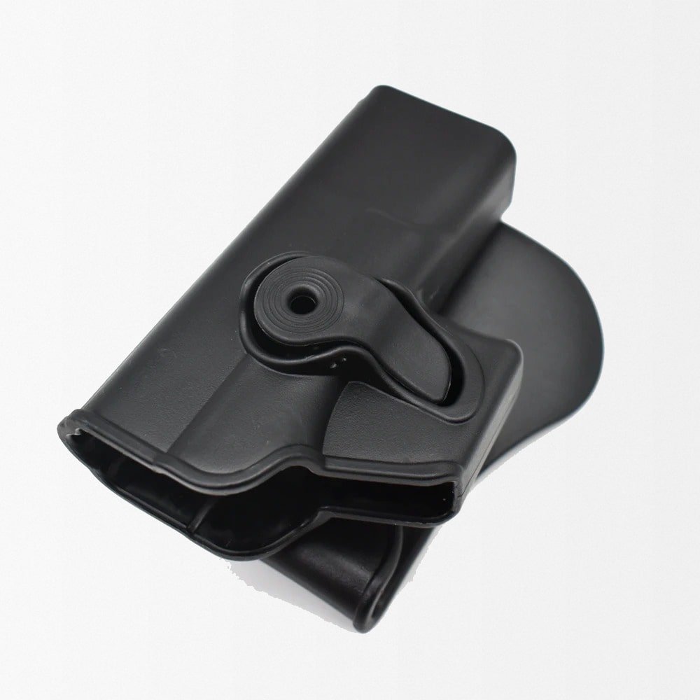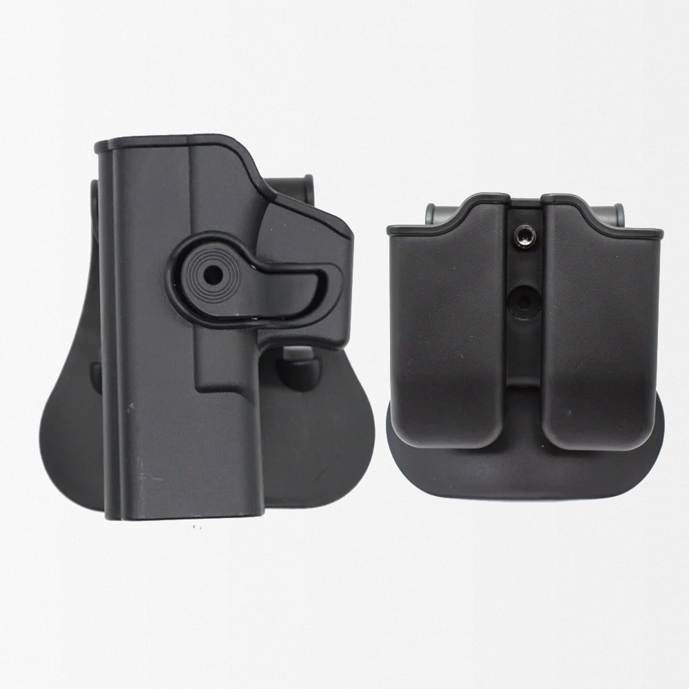 Engineered for precision and speed, this Glock 17 holster offers a contoured fit for maximum comfort. Crafted from durable plastic and polymer, it ensures rapid draw and reholstering. Ideal for outdoor paintball and hunting, it accommodates multiple Glock models and includes dual magazine pouches for seamless reloads. Available in black, sand, and green.
