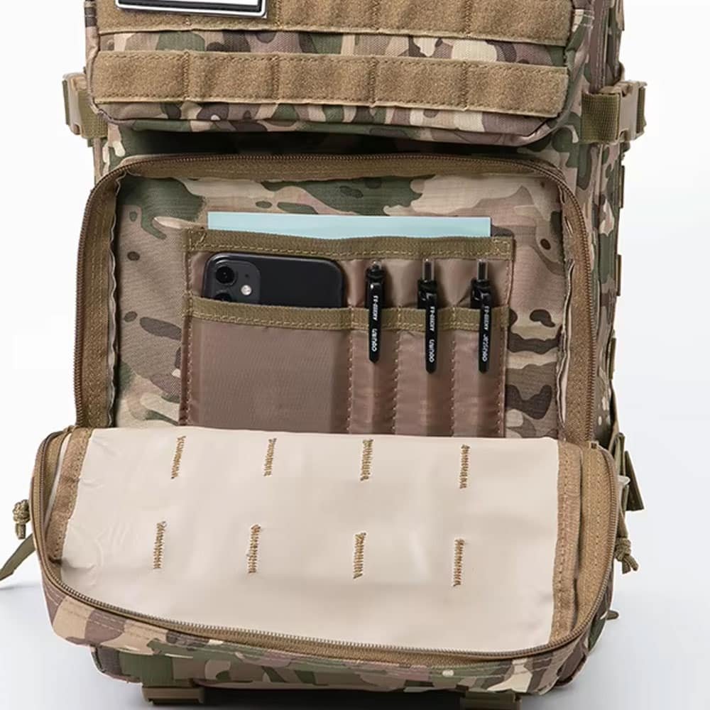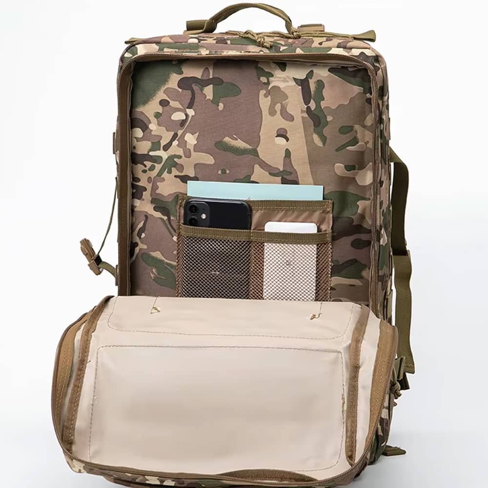 Designed for the tactical enthusiast, this Multicam molle backpack offers 45L of versatile storage. Its durable polyester construction ensures resilience in rugged terrains, while the molle system allows for customizable gear attachment. Perfect for extended outdoor missions or professional use, it combines functionality with a sleek, camouflaged design.