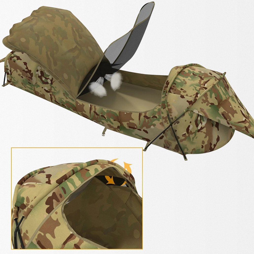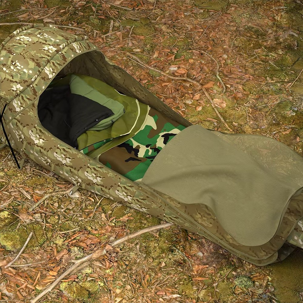 Experience the ultimate in stealth and efficiency with our Stealth Bivy Tent Sleeping Bag. Designed for solo missions, this 3-season tent offers superior protection against rain, wind, and snow with its 2000-3000 mm waterproof index. The lightweight aluminum alloy frame ensures quick setup, while the multicam polyester exterior blends seamlessly into any environment. Perfect for tactical operations, hiking, or emergency preparedness.