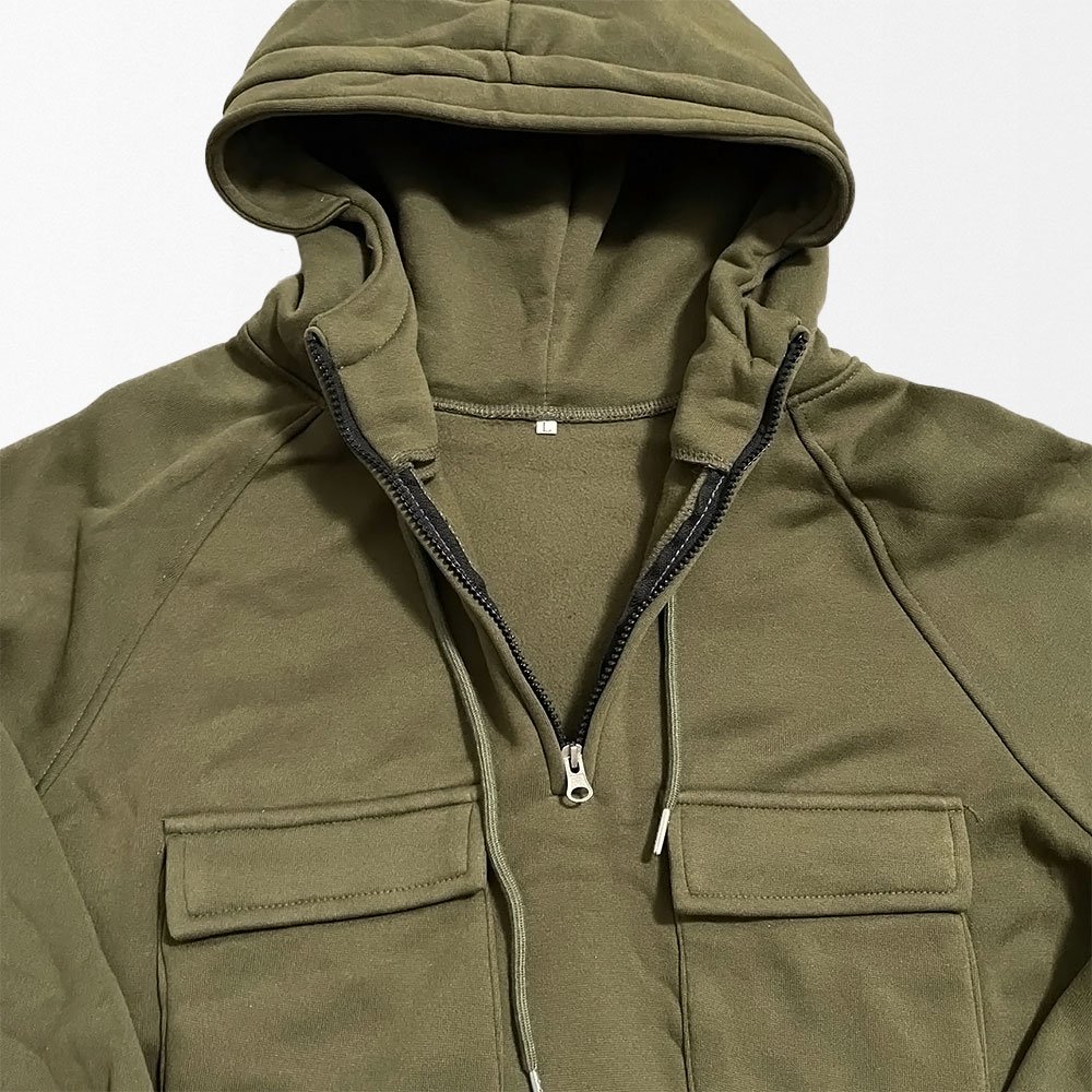 Stay warm and stylish with this Tactical Half Zipper Hoodie, ideal for autumn and winter. Its cotton-polyester blend offers comfort and durability, making it perfect for casual outings or outdoor adventures. Available in solid colors like black, grey, and green, it pairs well with any outfit.