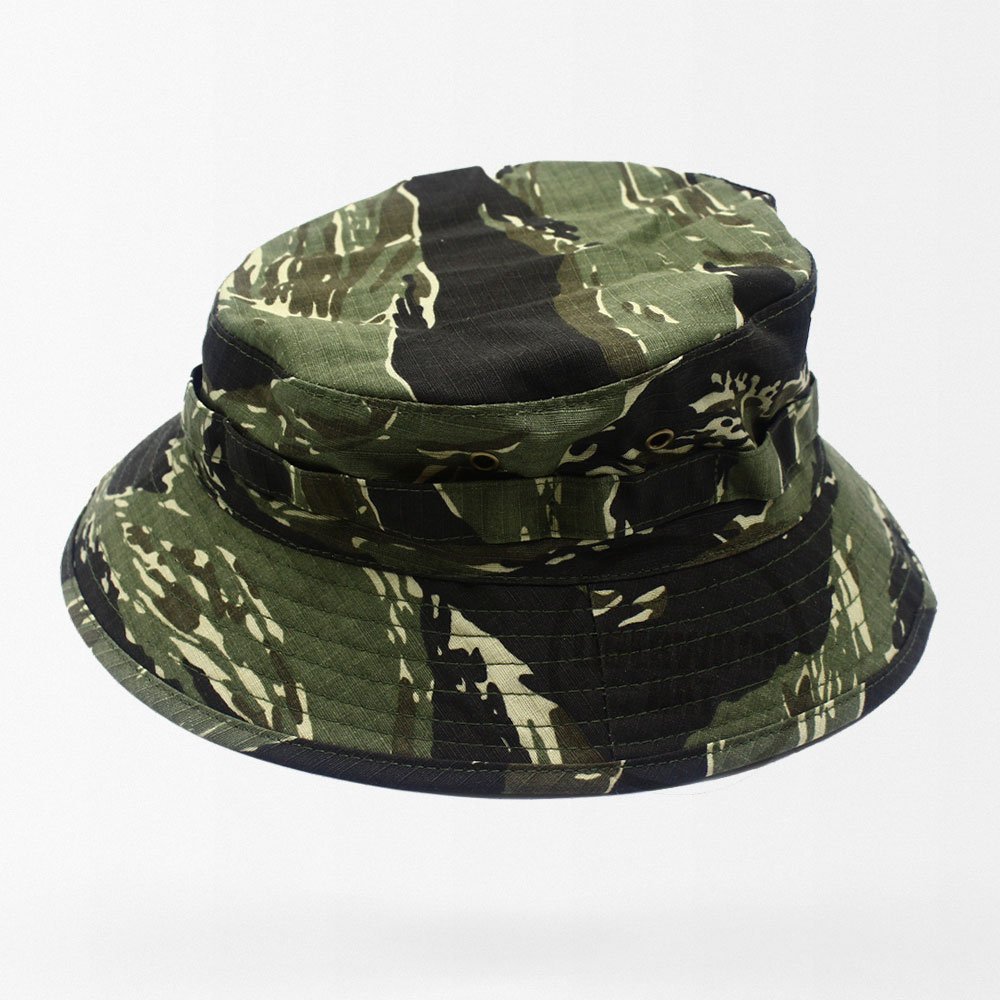 The Tiger Stripe Bush Hat showcases its iconic camo pattern, making a bold statement on the battlefield. Its wide brim shields you from the sun and rain, ensuring optimal performance in all conditions. Equip yourself with this eye-catching and functional bush hat.