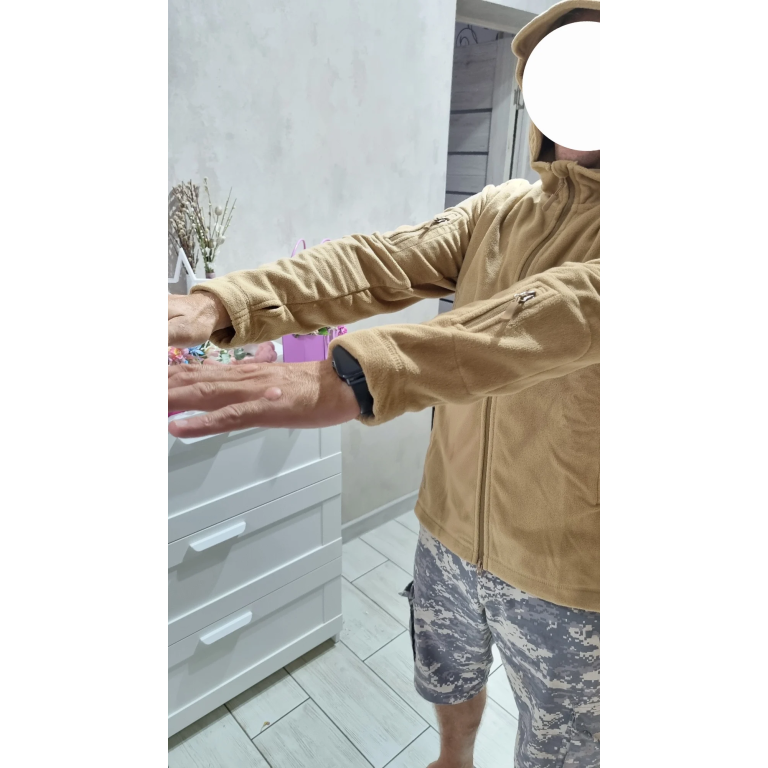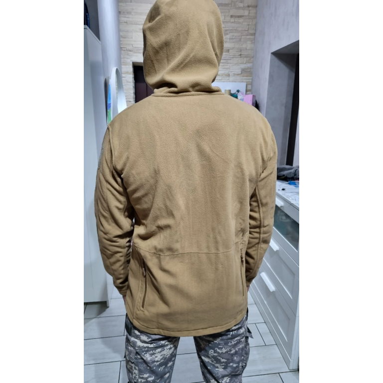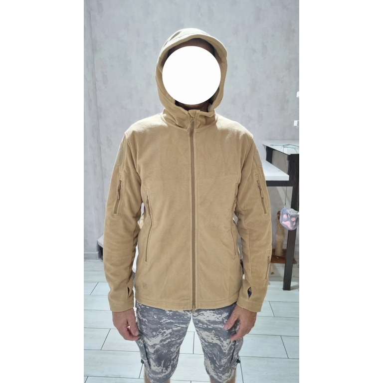 The fleece is quite dense. The hood is large, it covers the head completely. Many pockets, afraid that there would be tricks, but no. Satisfied with the purchase.